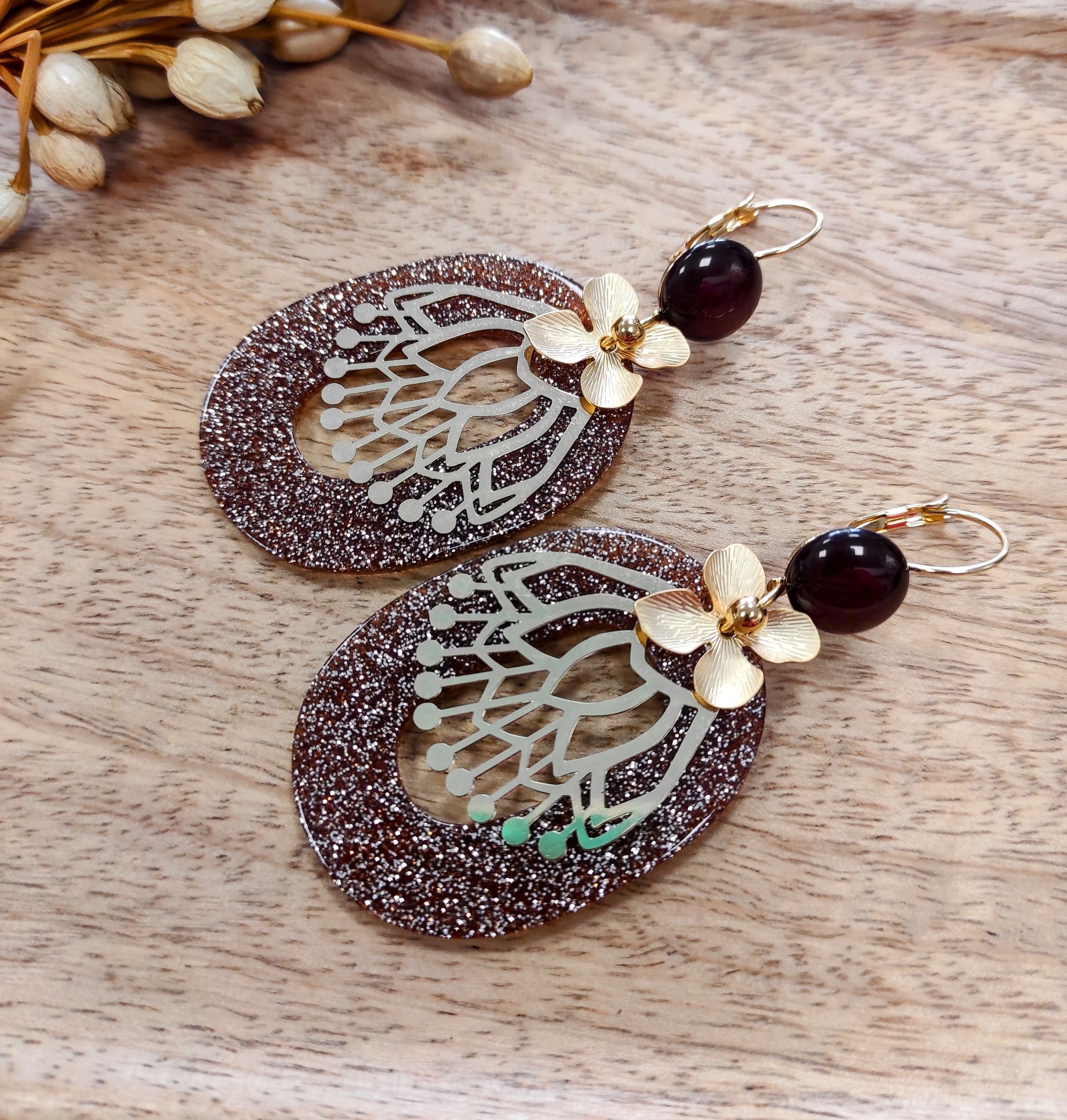 Les boucles d'oreilles Cléa sont montées sur une dormeuse en acier inoxydable sur laquelle est collé un cabochon en acrylique vert