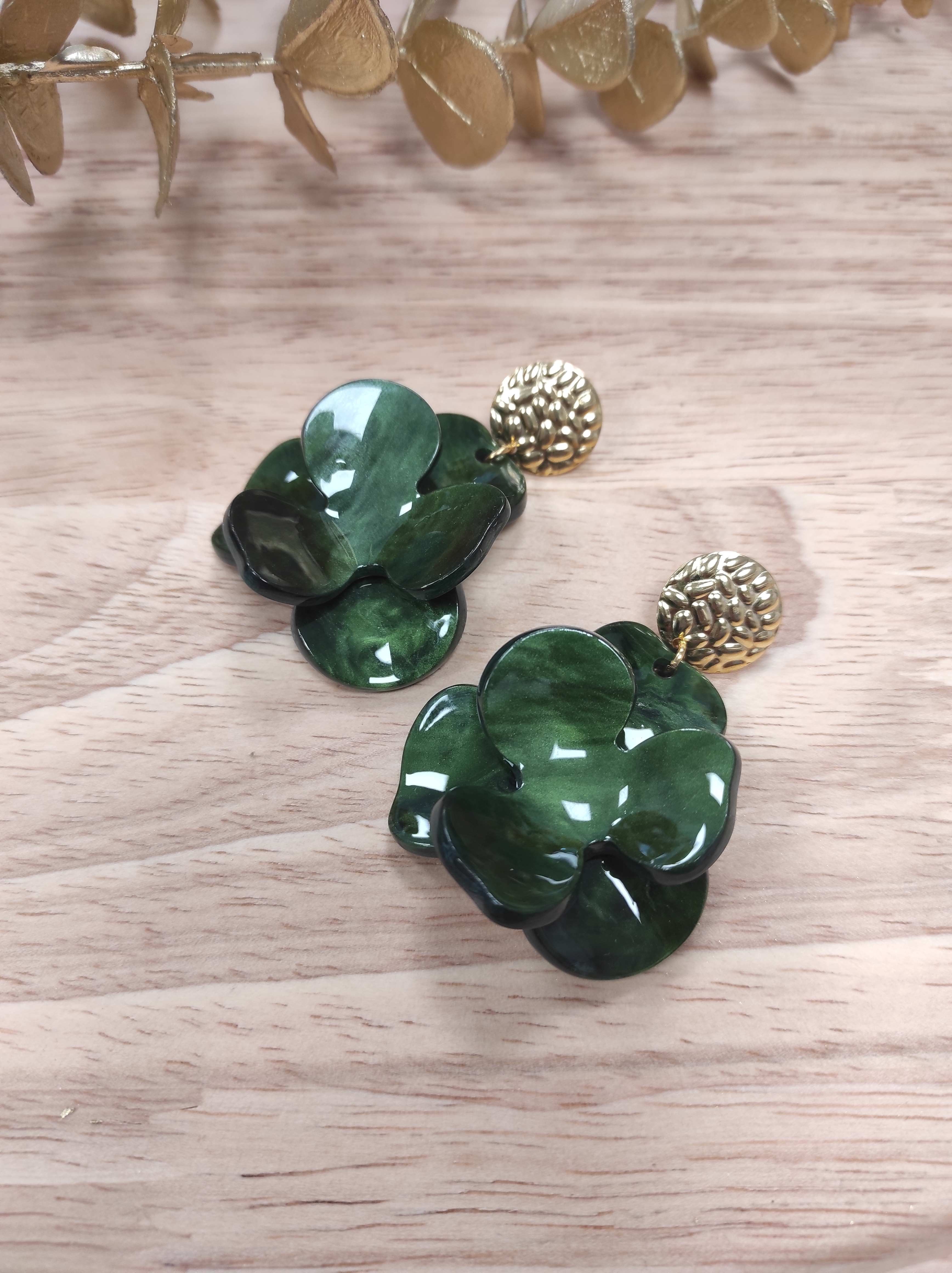 Boucles d’oreilles en acétate vert à effet marbré, avec puce ronde dorée texturée. Le motif fleur apporte du volume sans être lourd : elles sont légères et agréables à porter toute la journée.